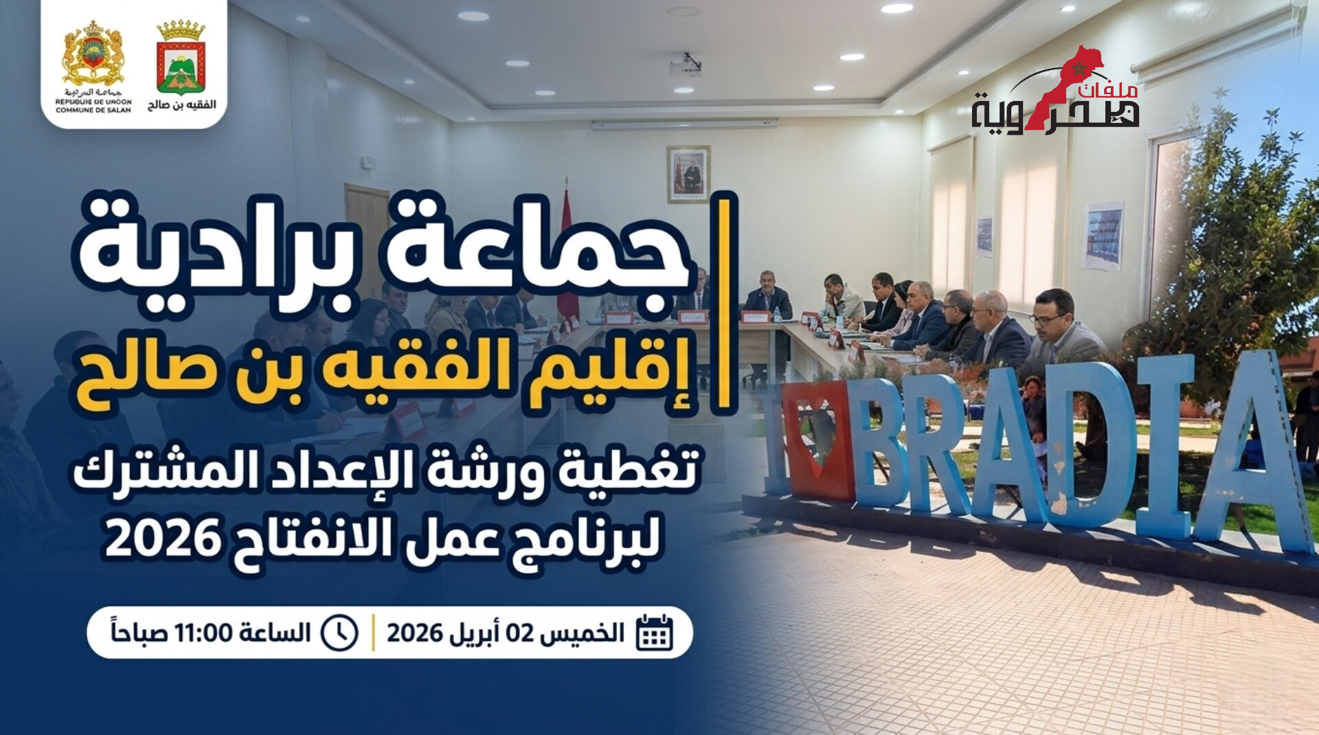 في خطوة تروم تكريس مبادئ الحكامة الجيدة والتدبير التشاركي، احتضنت قاعة الاجتماعات بمقر جماعة البرادية التابعة لإقليم الفقيه بن صالح، يوم الخميس 02 أبريل 2026، أشغال ورشة الإعداد المشترك لـ”برنامج عمل الانفتاح”. وتندرج هذه المحطة الاستراتيجية ضمن التزام الجماعة بالتأسيس لمرحلة جديدة من التفاعل الإيجابي مع محيطها، في إطار برنامج دعم الجماعات الترابية المنفتحة.