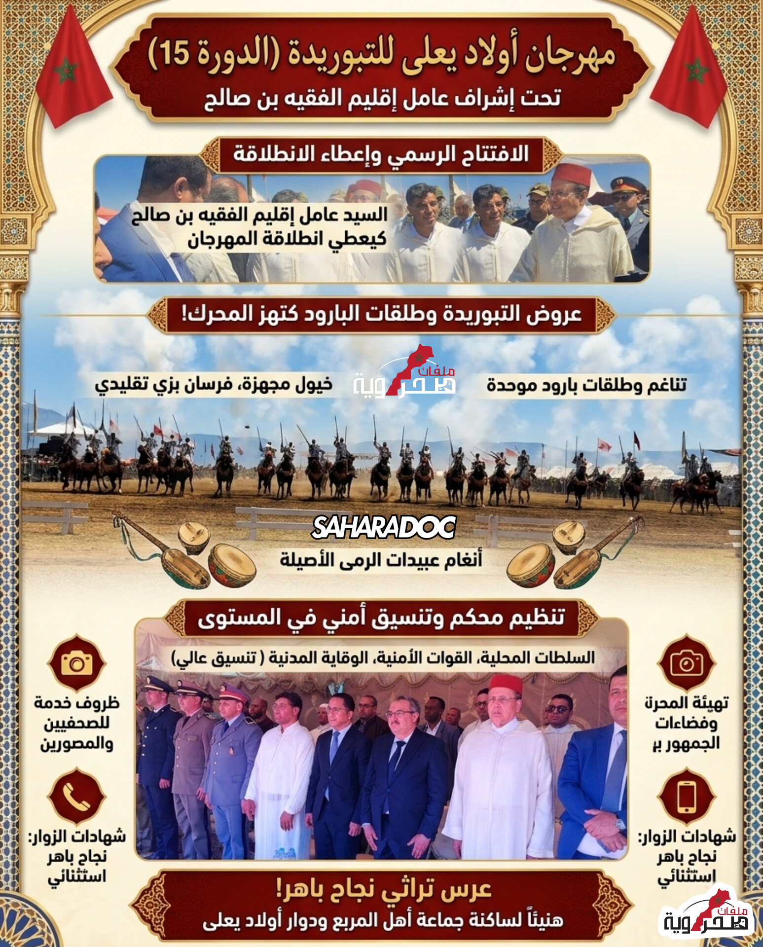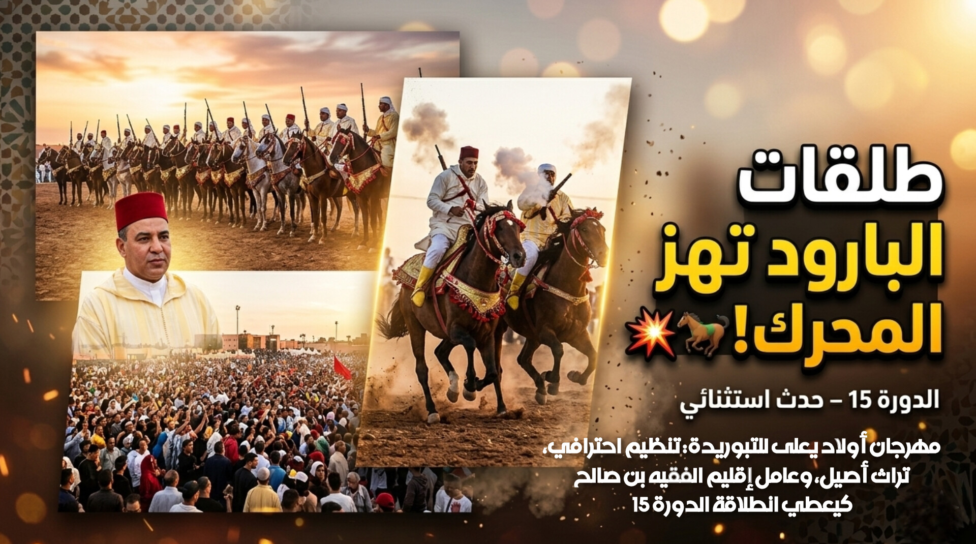 في أجواء احتفالية ساحرة تمتزج فيها أصالة الماضي بعبق التاريخ المغربي المجيد، انطلقت بقرية “أولاد يعلى” التابعة لجماعة أهل المربع، فعاليات الدورة الخامسة عشرة لمهرجان “العهد” للتبوريدة بإقليم الفقيه بن صالح. وقد اكتسى هذا العرس الثقافي والرياضي طابعاً رسمياً ومتميزاً بإشراف السيد عامل الإقليم شخصياً على حفل افتتاحه، في خطوة تعكس العناية الفائقة التي توليها السلطات الإقليمية والمحلية لصون التراث اللامادي والاحتفاء بفروسية الأجداد كجزء لا يتجزأ من الهوية الوطنية.